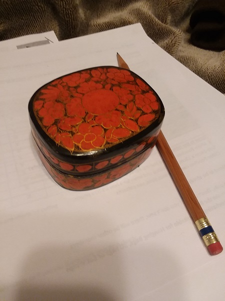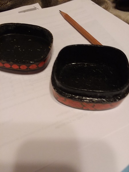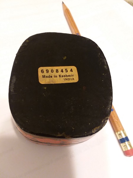 Item #31 - small empty box. This box may be antique or it may just be cheap tat from the 80s. I should probably mention that my grandmother was an antique dealer, which is why I have so much weird stuff in my house that I don't know where it came from. This feels like lacquered cardboard or something similar. There is a sticker on the bottom that says "Made in Kashmir INDIA" and the lid comes off to show it's empty. (pencil for scale)
