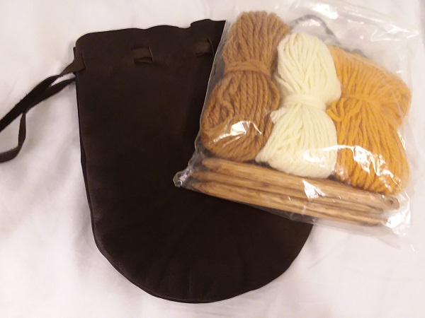 Item #36 - mystery yarn thing with bag. I don't know what this is. Some kind of craft project. There are three different colors of ugly yarn and some sticks with holes in them. Comes in a leather bag that would work well as the biggest dice bag ever. I forgot to put in a pencil for scale but the bag would hold a small grapefruit probably.