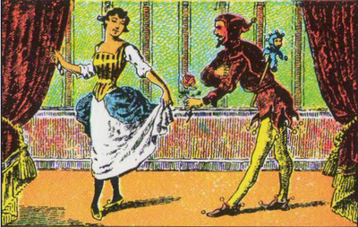 Did you see the responses in the comments section? Richard Todd and Guido were correct! The card is the first trump in the French Ducale Tarot deck. According to Thomas L. McDonald's State of Play blog, the card depicts an Italian Pagliacci and a French jester holding his ninny stick.