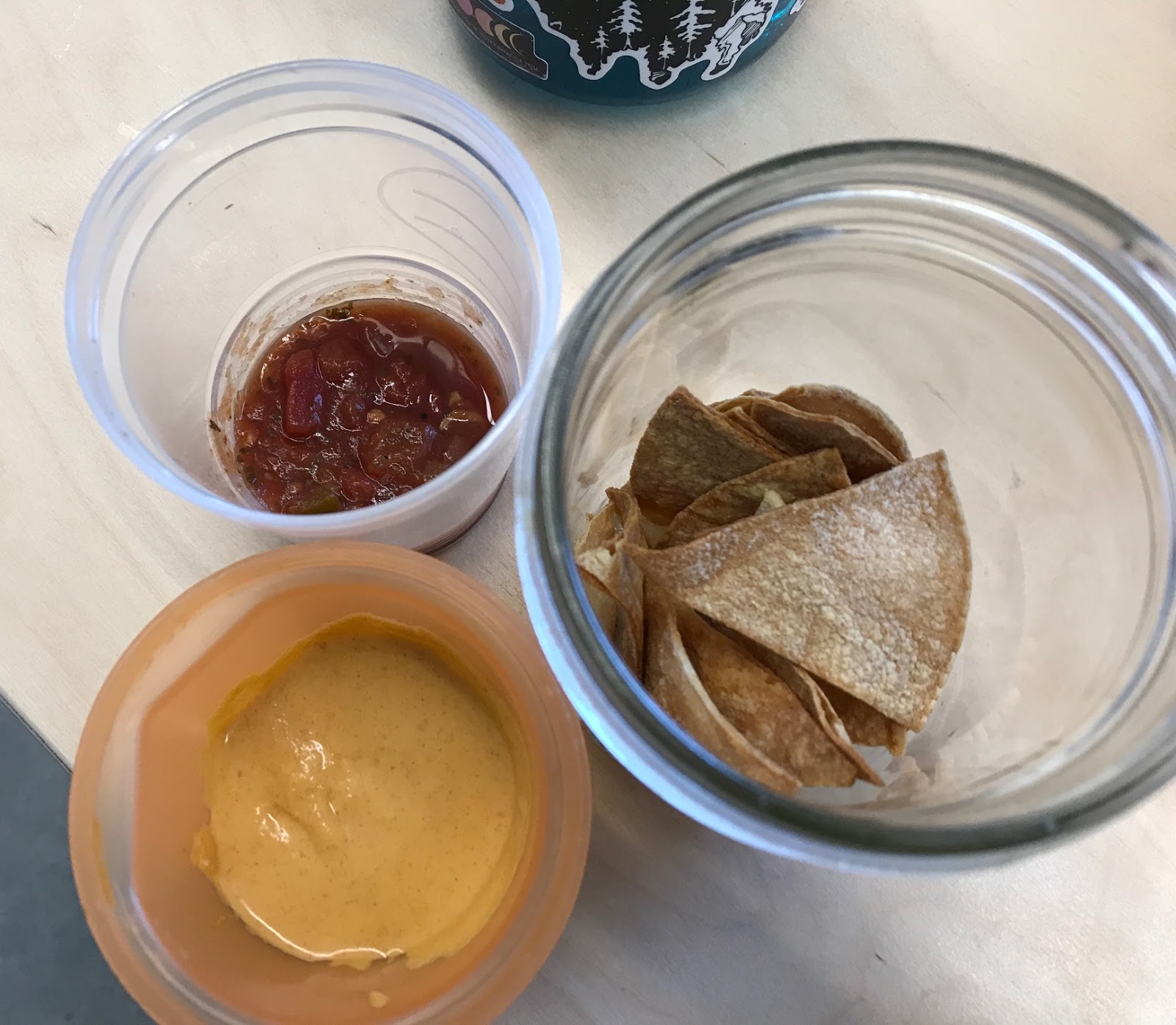 Here's a recap of Friday through Sunday. On Friday morning, I had a Larabar before my 6:15 am bootcamp class, and then I had a post-workout banana. Breakfast was a raspberry strawberry protein smoothie, and morning snack was Baked Corn Chips with Vegan Queso & Salsa.