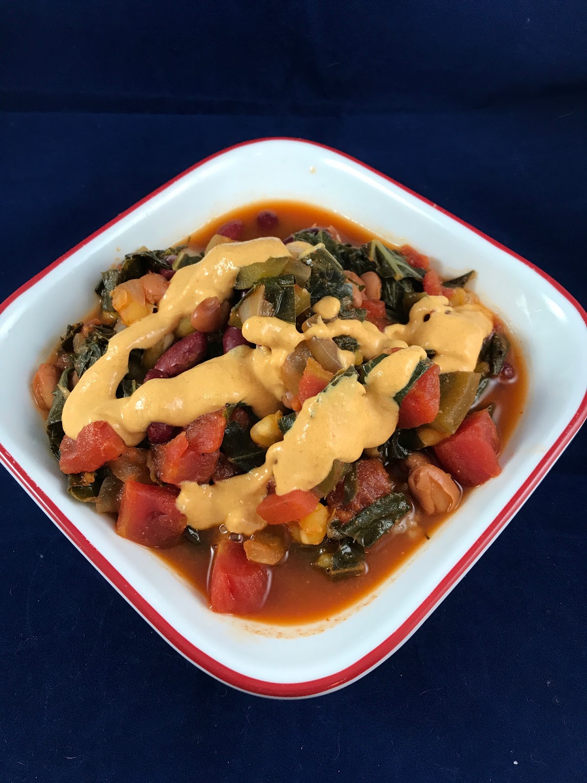 Afternoon snack was fruit, as usual. And then for dinner, I had Cowboy Chili, topped with vegan cauliflower-cashew queso. This was supposed to be made with blackeyed peas and kidney beans, but I forgot the peas at the grocery store. So I used pintos since that's what I had. What I love most about this chili is the hominy and collard greens, both unique ingredients for a chili.