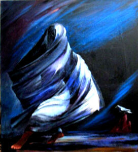 في لوحته “رحماك” والتي ستشارك في المعرض القريب الذي يعد له الفنان في الأردن، نحن سنتعايش مع هذه اللوحة كأنها إلياذة جديدة عصرية حان عزفها وهي خلاصة أحاسيس إنسانية شعرية يصعب أن نحدد معانيها لأنها ضاربة في الشعرية رغم وجود ملامح شكلية لبعض الجوانب يمكن أن يجتهد المتلقي لفهمها، هذه المرأة تبدو كأنها على شراشف فرشها لها البحر لتطمئن ولكنه كمن غدر بها، بين عالمين، بل عدة عوالم متداخلة، العالم الأسطوري فهذه بنت أرض كنعان القداسة والحكمة والقوة والجمال، المركز تحتله المرأة بفستانها الملكي الأحمر، نتعايش مع مشهدية درامية مفجعة، يبدو أن قوة خفية ومخفية تجذب الشخصية ربما لتقودها في رحلة إلى العالم الغير مرئي كمرآة اورفي في فيلم اورفي لجان كوكتو، يوجد ما يشبه برأس الحصان كأنه يركض منتفضا أو عائدا من معركة مرعبة، هذا الموج الهادر كتسونامي يمتلك من القوة والرعب ما يمكنه أن يدمر الكون، أسفل اللوحة كأننا مع جسد مكفن يعبر عن قداسة تلك الأرواح الطاهرة التي نفقدها كل يوم، ذلك الطائر البحري ليؤكد قيمة أغاني البحر وجماله ورقته.