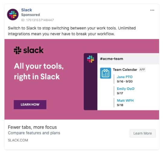 By comparing your product or service to one that your audience already uses, you can showcase why yours is better. Encourage them to make the switch or at least learn why they should consider it. This ad from Slack makes the point that your current workflow is clunky and that switching your strategy will give you countless options for streamlining it.