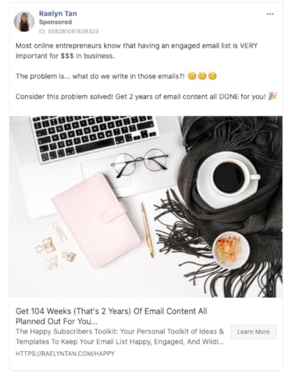 Exactly what will your product do for your audience? Paint a picture of what life would look like after they’ve tried your solution. Business leaders need to make decisions fast, so they have to know what you’re offering without doing extra work. In this ad, Raelyn Tan offers two full years of weekly email content that’s already planned and optimized for engagement.