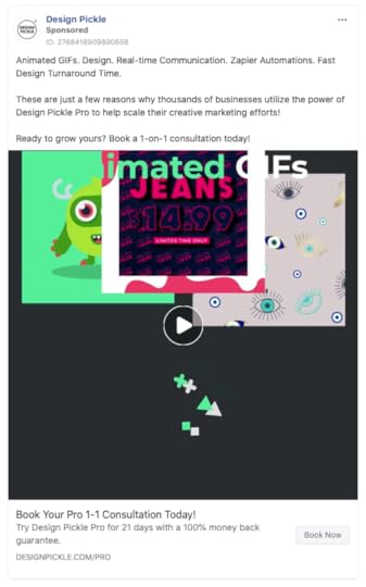 Again, be exceedingly clear. What is the customer getting? You’re dealing with professionals in a B2B audience, and they need to know what exactly they’ll receive and why it’s valuable. Here’s another example: Design Pickle efficiently lists what you get by using its service, and the ad also states your next step: booking a consultation.