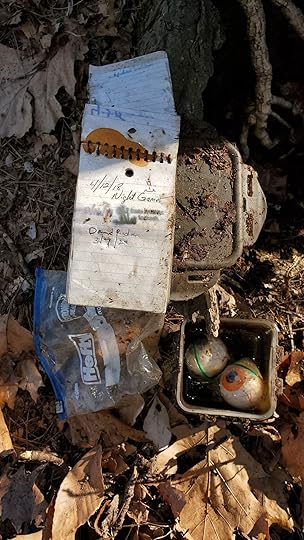 At ground zero, I found the perfect host but, at first, there was no sign of the container. Rather than give up, I started digging in the mud and... bravo!... at last struck paydirt. The container was buried under about six inches of muck. The lid was cracked, the container full of water. Yuck. I did manage to get my signature on the soggy log. I cleaned things up a bit, but I couldn't do anything about the cracked lid.