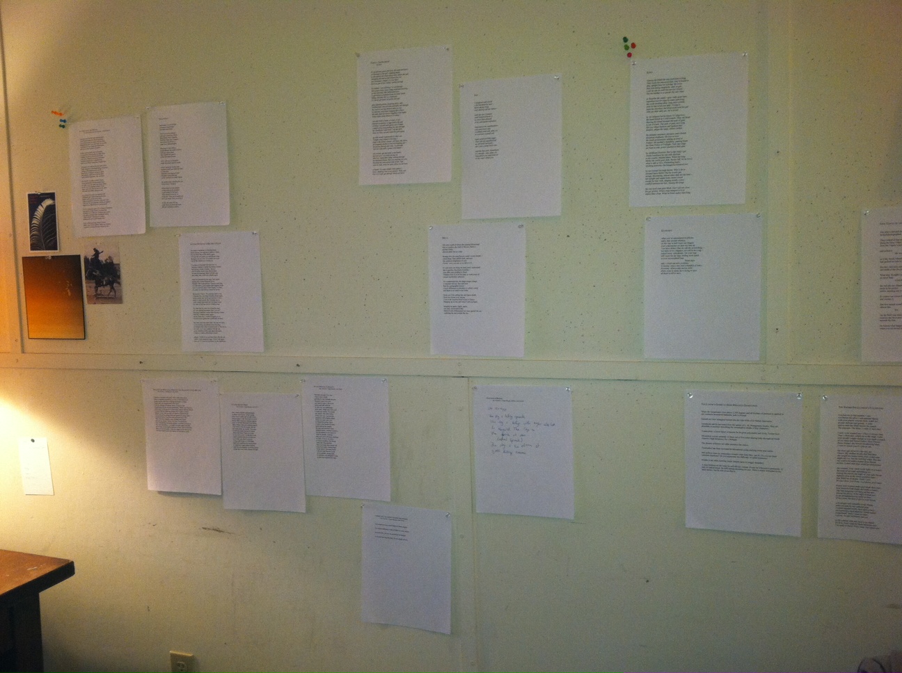 ...when you're push-pinning your entire poetry manuscript (or what exists of it so far) to the wall. It's the best way to explore different sequences, recognize patterns--not just thematic ones but style of last line, shapes on the page--and understand the book as a whole. Plus I like the way the pages flutter when a breeze comes into the room.