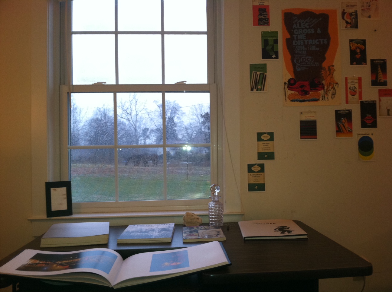 Because the furnishings tend to be a bit ratty and the decor spartan, it's a priority to make it feel like home. This time around my inspiration table holds books of art by Anselm Kiefer, Kara Walker, and Hiroshi Sugimoto; a big beautiful portfolio of photographs called Mississippi: State of Blues; and the graphic novel Cuba: My Revolution, by Inverna Lockpez and my friend Dean Haspiel. The erasure on the windowsill was handmade for me by the poet Hailey Leithauser. I bought that cut-glass decanter at a rusted-out yard sale in Johnstown when I went to my very first art colony, Vermont Studio Center. There is a hunk of coral beside it I picked up when staying in Miami with the LegalArt crew. And the wall is festooned with Penguin book cover postcards (the novelist Dylan Landis gave me a whole box of them for my birthday) and an amazing concert poster designed and screened by DC artist Anthony Dihle.