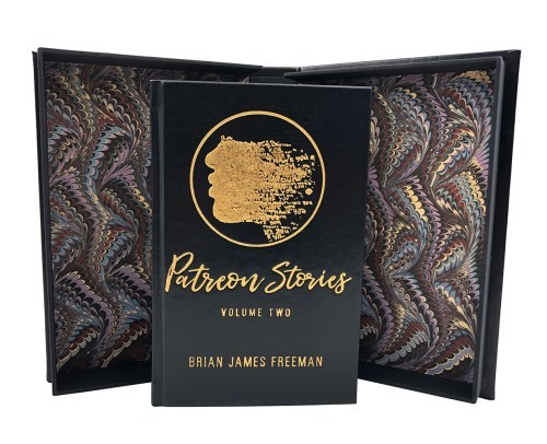 The first copy of the hand-bound Patreon Stories: Volume Two Lettered Edition has arrived, and Im really pleased with how this edition turned out. The book features real leather and imported hand-marbled endpapers, with a matching leather traycase. Best of all, this very special edition should ship later this week, assuming the postal system doesnt shut down!