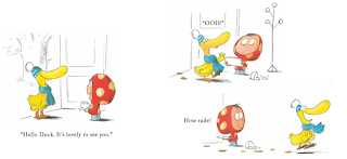Clare Helen Welsh1. Dot: Hello, Dot. Lovely to see you. SMASH! [Duck knocks the sugar to the floor] Dot: How rude! 2. Duck: A tea party! Cool! Hang these up. [Duck throws hat and scarf on the floor] Dot: How rude!
