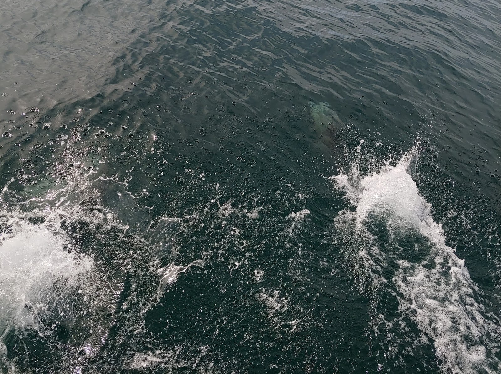There they were frolicking in the shallow water between the shore and the line of buoys that keep boats away from swimmers. Rythmically coming up for air, sometimes just a fin, sometimes a full face, and once in a great while a jump out of the water and splash.