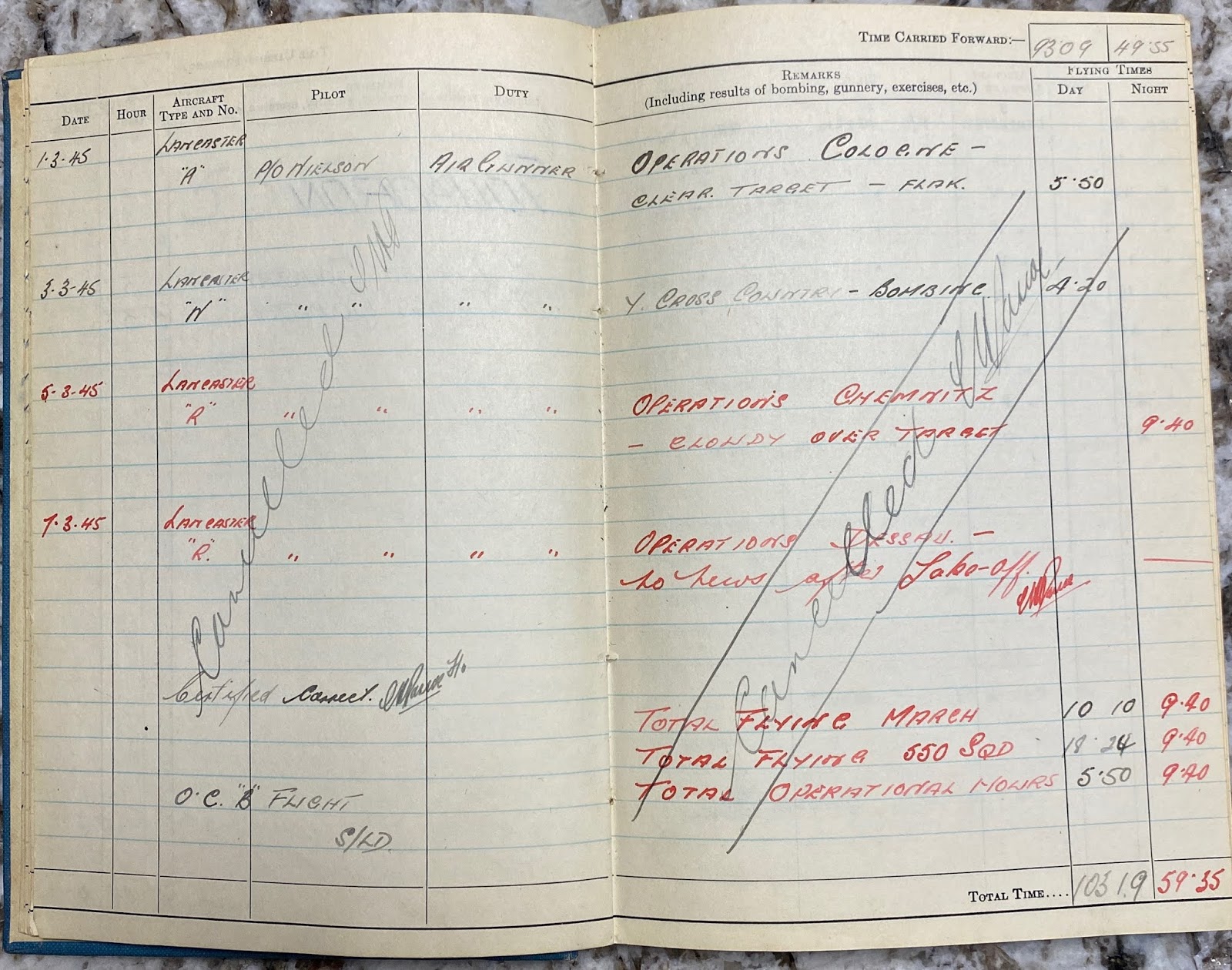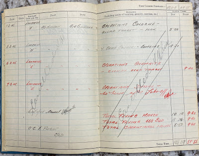 It is unclear why in Hicks' flight logs (courtesy the Hicks family) a page of March 1945 operations appears on the page prior to February, and stranger still that they are crossed out. There is no record of Hicks having ever flown with