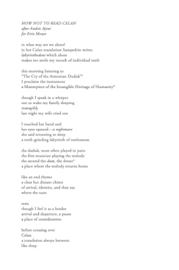After "How Not. to Read Celan" by Andrés Ajens (trans. by Erín Moure) published in