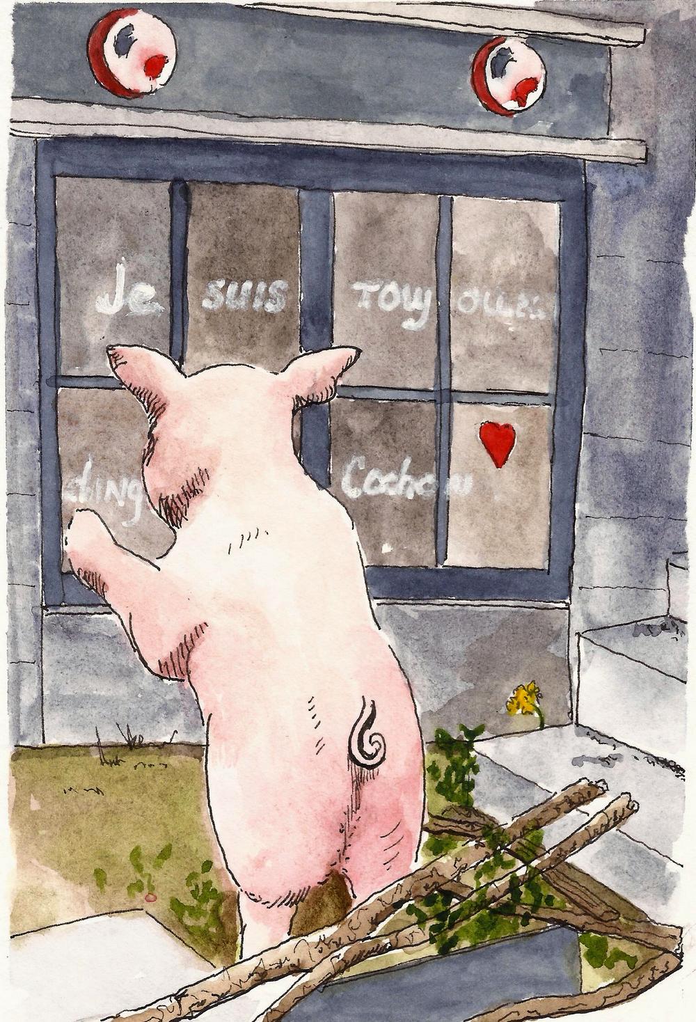In Quebec City we have a couple restaurants called Cochon Dingue (crazy pig). In the old city there is one that faces a main street but they have a back entrance on a rather famous pedestrian street full of shops to grab tourist dollars. Next to the the entrance is a rather plain window that looks in on this backdoor entrance. It seems I was not the only one interested in that window.