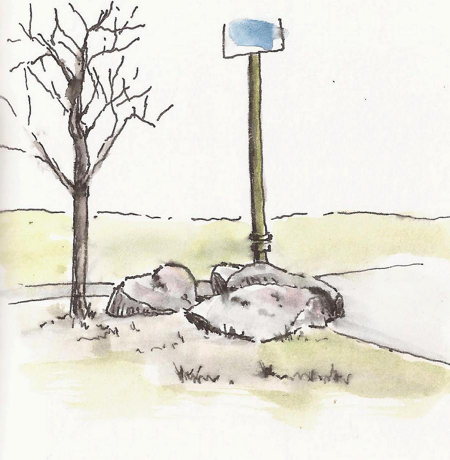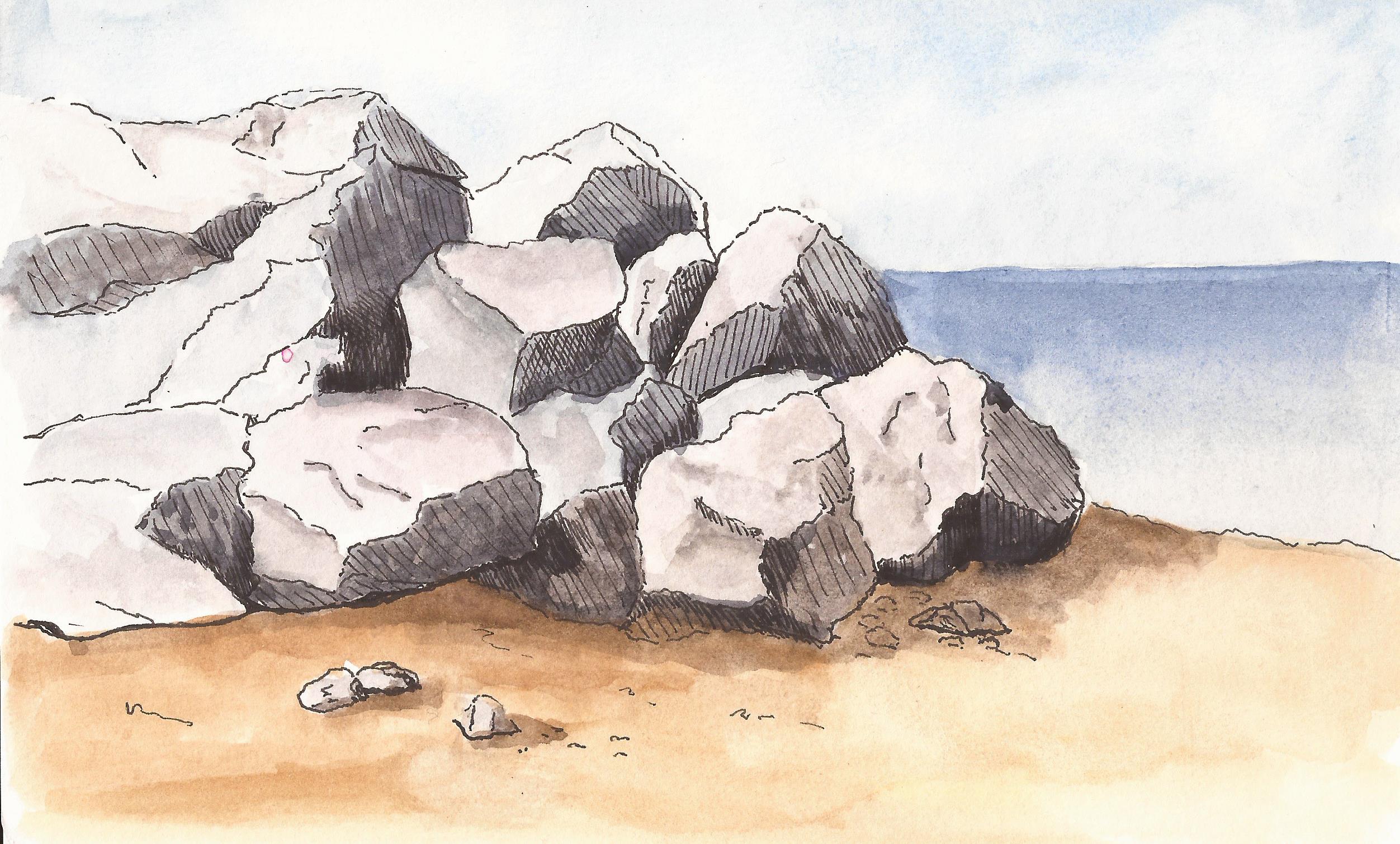 As I’m prone to do these days, I was sitting around, listening to a podcast when a pen leaped into my hand and drew a rock.  I thought, that’s ok, but it needs a friend.  So I drew another rock.  Pretty soon I had a pile of rocks so I put a bit of sand in front of the pile, a bit of ocean and sky behind it, and I had a landscape…well, sort of.  In truth the rocks don’t go together as well as they would if I were drawing them on location but l’m ignoring that and sharing it with you.