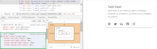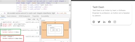 But it is not uniform. Top Left, Bottom Right is 24px and Top Right, Bottom Left is 4px. To make it the same across all the corners we need to add the same radius, of course. To so that, we can add a class to the v-card and write CSS rules accordingly.