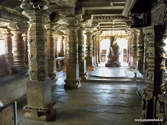 நாங்கள் இதுவரை பார்த்த கோயில்களில் சிற்ப நுட்பங்களில் உச்சம் என்பது ராமப்பா கோயில் [ஆந்திராவில் உள்ள நல்கொண்டா மாவட்டத்தில், சென்ற இந்தியப் பயணத்தில் பார்த்தோம்] அதற்கு இணையான கோயில் என இதைச் சொல்லலாம். உயரமற்ற அழகிய கோபுரம் கொண்ட கருவறை. அதற்கு முன்பாக வரிசையாக மண்டபங்கள். உருளையாகத் தீட்டப்பட்ட தூண்கள். கன்னங்கரிய கல். குறிப்பாகக் கோயிலுக்கு முன்னால் உள்ள பெரிய அணிமண்டபத்தின் புஷ்பவிதானம் ஒருநாள் முழுக்க அமர்ந்து பார்த்தாலும் தீராத செறிவுகொண்டது.