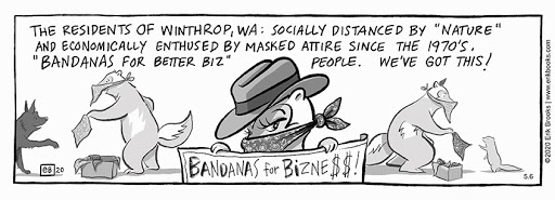 In 1972 my little western town of Winthrop, WA decided to re-brand as a wooden boardwalk, "western" in the old fashioned send of the word, kinda tourist hub. It's generally worked and has been good for business. Like any place with a "code" there are certainly ups and downs - not to mention the fact that "western" expansion into once remote territories had many problems of its own. Putting aside all of that and in favor of a positive spin that might help squelch the politicization of mask wearing, when local business DO get the chance to open up a little more and get back to "norm" we have a ready-made opportunity to have a "costume" (bandana mask) that fits the town sensibility AND keeps the workers and the tourists necessary for livelihood safe and sound. Be smart people. Wear a mask!