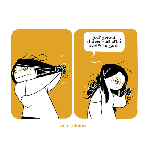 [Description: A two panel comic. I am struggling in the first panel to detangle my hair with my hands. In the second panel I glare at a tuft of hair saying: ‘just gonna shave it all off, i swear to god.’]