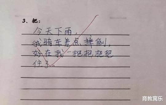 我们小时候常常做过这样的题,把“被”字句改成“把”字句,或者把“把”字句改成“被”字句,对于“被”跟“把”的意思也都理解。第三位小朋友是用“把”字造句,接连用了四个把字,很多朋友读的时候可能被绕晕了,仔细分析会发现,其实第一个“把”是一下子的意思,第二个“把”是把字句的把,第三个“把”是车把的意思,第四个把是动词,表示把控、控制的意思。