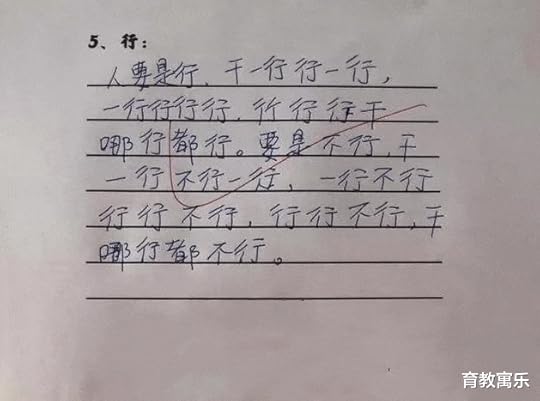 第五个是用“行”字造句,众所周知,它是一个多音字,对于这个多音字,第五位小朋友可谓是充分发挥了“行”字多音字的优势,写了很长的一句话,用了很多个“行”字,把它的词性、多音字准确地结合起来,不免想对这位朋友说:“这语言功底不是一般的深厚啊”。更有调皮的网友说,那这个让老外考汉语的四六级,估计他们会哭晕在厕所吧。