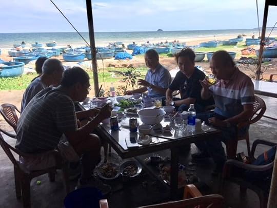 Bữa trưa đúng phong vị biển, bởi nơi quán tiếp với biển với những thuyền thúng câu mực, thả lưới bắt cua ghẹ đang thả mình trên bãi sau một đêm dài lên đênh trên ngọn sóng. Nếu như các cụ Tản Đà, Vũ Bằng có sống lại và ngồi đây, lúc này, hẳn cũng không thể lắc đầu, bởi sự chọn lựa món ăn từ một người sành ăn như anh Minh thì không ai chê nổi. Trước đó mấy phút, các vệ binh của Long hải Diêm vương còn vươn vòi, ngo ngoe càng, giương vây bơi lội quanh hồ nhỏ, giờ đã đổi màu nằm im trên dĩa: mực luộc, tôm hấp, cua biển rang me, cháo cá mú… khiến tôi có cảm giác như chiếc bàn ăn sắp bị lún sâu xuống nền cát vài phân!
