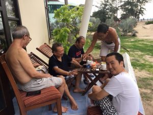 Riêng ông bác sĩ, nhà thơ, du sỹ, thiền sỹ, cư sỹ… thì phong thái đời và đạo trộn lại làm một. Từ cái ăn, cái ngủ chí cách đi đứng nói cười…tôi có cảm giác thiệt và giỡn nơi anh chính là giỡn và thiệt. Anh thở mà không thở, ăn như không ăn mà ăn! Đáo bỉ ngạn rồi chăng? Đêm ngủ cùng phòng, anh cho ếch kêu vang dậy, lúc ồm ộp, khi nỉ non ai oán như mùa chúng động dục, đến nỗi tôi phải vác chăn ra hành lang nằm, phải thêm vài ba ly rượu để ngủ vùi. Nhưng khi ngâm mình dưới nước biển, tôi mới “ngộ” ra: ếch kêu là ếch không kêu. Những tối tiếp theo, tôi đánh một giấc dài không mộng mị chiêm bao. Anh xem, tôi cũng mon men tới chỗ “đạo khả đạo phi thường đạo” rồi đó chăng?
