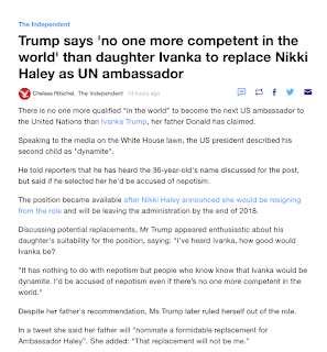 “Trump says ’no one more competent in the world’ than daughter Ivanka to replace Nikki Haley as UN ambassador.”