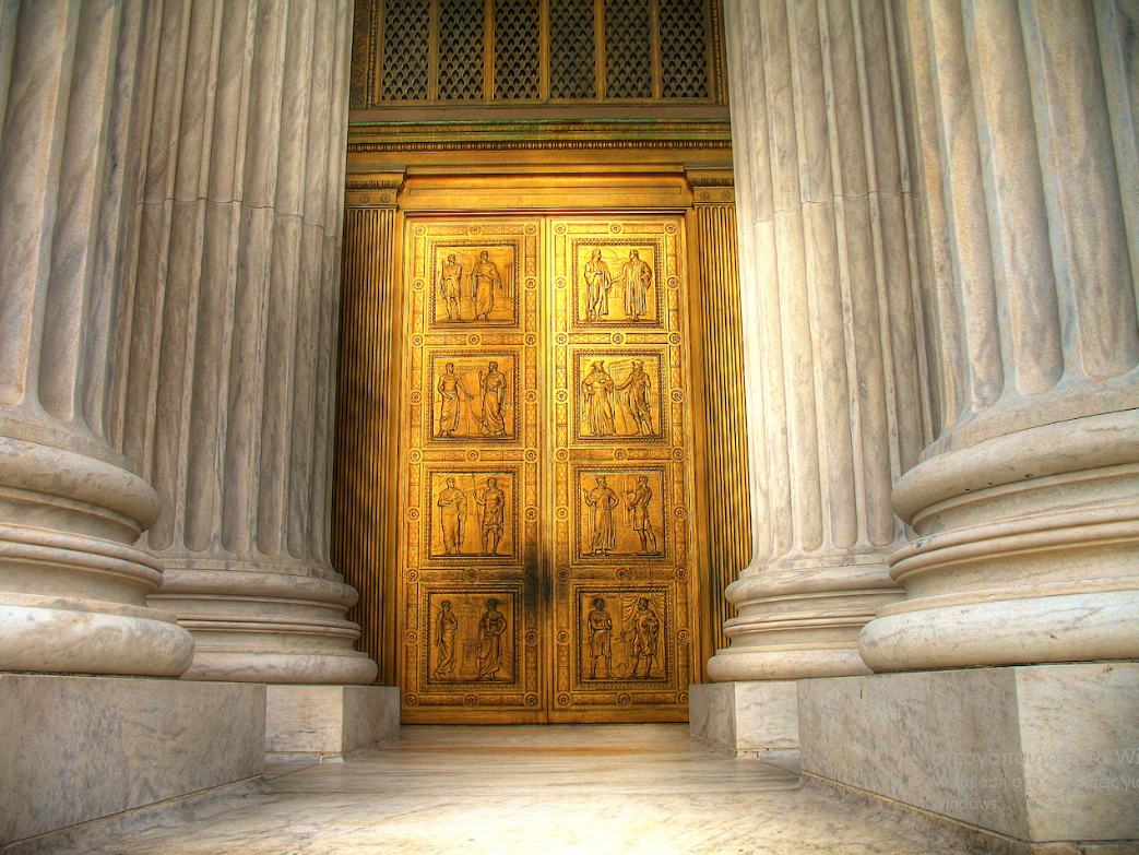 Μνημειακή ορειχάλκινη θύρα Ανωτάτου Δικαστηρίου με ανάγλυφα της ιστορίας του Δικαίου