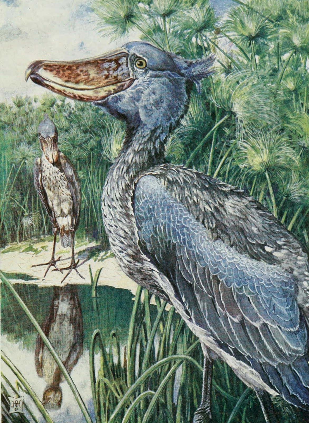 Another pair of shoebills in their natural habitat, this time painted by okapi discoverer Sir Harry Johnston and published in 1902 (public domain)