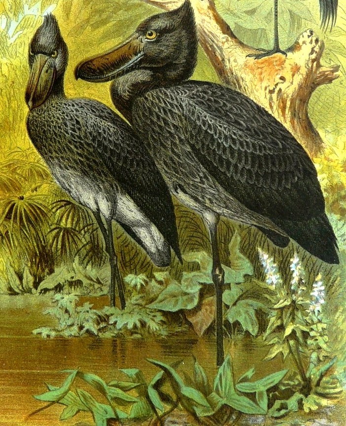 Section from an 1870s chromatolithograph depicting a pair of shoebills in their natural swampland habitat (public domain)