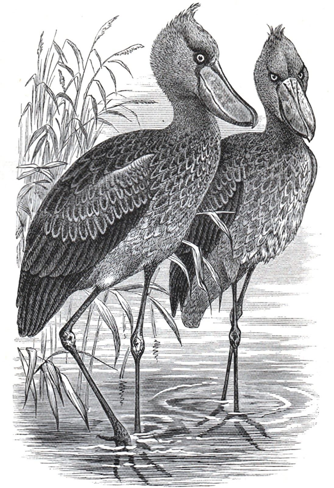 An exquisite engraving from 1860 depicting a pair of shoebills (public domain )