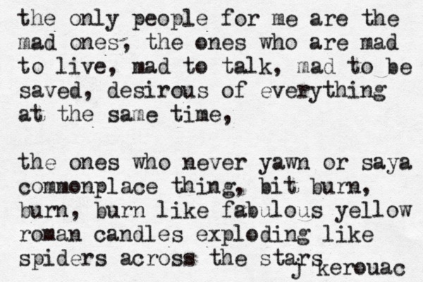 Into the wild - Jack Kerouac"La única gente para mi son los locos, aquellos que están locos por vivir, locos por hablar, locos por ser salvados, deseosos de todo al mismo tiempo, aquellos que nunca bostezan o dicen o caen en lugares comunes, aquellos que arden, arden, arden como las fabulosas velas romanas amarillas explotando como arañas a través de las estrellas. "