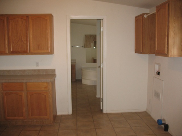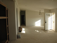 Laundry room looking into master bath.At last the carpet guys showed up and started setting up. His first discovery - no water outside. What? How can that be? Luckily he could hook up in the laundry room. He then walked the house and informed me I had multiple doggie spots in several rooms. What? He was a bit perplexed because of the lack of odor. Believe me, if the house had smelled bad I would not have wanted it. I have had dogs and cats and cannot stand the smell of their messes. But I sure as heck don't let my animals use my carpet for their relief. So he pre-treated and made several passes over most of the carpet. I can only hope the spots don't come back but I have my doubts. I'm figuring I need to start a savings for new carpet in two years. What brilliant mind chose white carpet in dusty horse country anyway??! And then let their dogs use it??!
