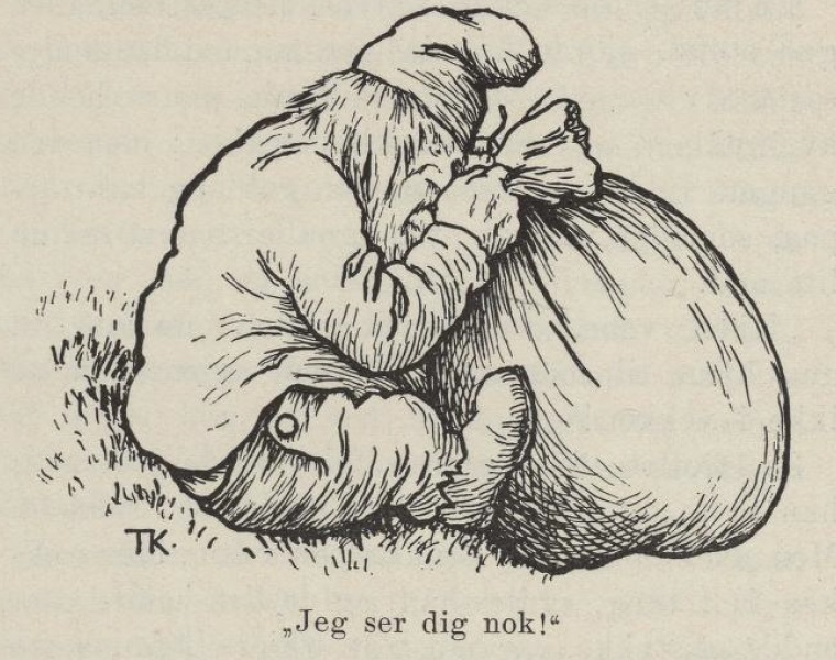 The troll was willing to take the sack, all right, but when he had got a bit on the way it was so heavy that that he thought he would see what was in it. ‘No matter how sharp her eyes are, she won’t see me from here,’ he thought. But as he set the sack down to look in it, the girl who was sitting inside called out,