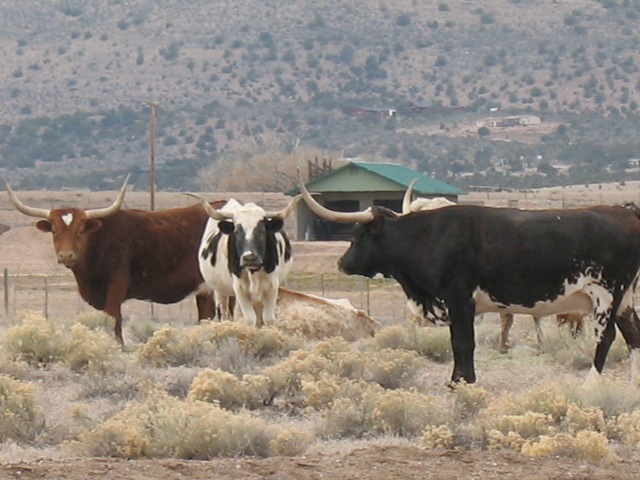 Driving through Chino Valley, I got excited to see the longhorn steer in the fields. I quickly drove off the road, grabbed my camera and darted across the road. Debra stayed put in the car. As I crept close to the fence, I yelled at the steers to get them to pose for the camera, while Debra yelled at me "Stop! They might charge." They were still quite a ways out and the fence was between us so I got a good laugh out of her advice. The steers didn't look too concerned with me.