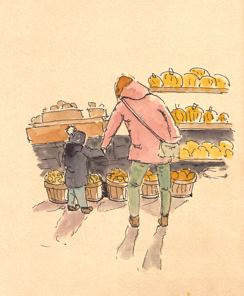 I got lucky with this sketch. Anyone who has tried knows that sketching moving people is hard. In this case there was a very long row of kiosks and this mother was enjoying (??) some time with her son. He wanted to touch everything, of course, and so it was fun to watch the interaction as they looked at pumpkins. I was lucky because I started grabbing the people shapes as they stood in front of one kiosk and they took up a position that was almost identical, in front of another kiosk and stood there for a while. I drew them and then the the first kiosk full of pumpkins. One thing about pumpkins, they don’t move.