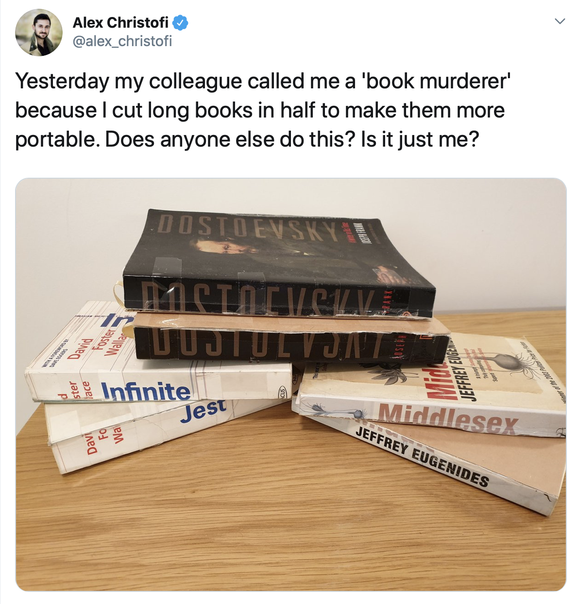 Tearing books in half is on a whole other level, but I can relate with that too. Especially as an adult, I have limited time for reading, and it can be daunting to see a thick wad of pages past my bookmark. If dividing it into two parts can make it easier to get through, then fine, be a book murderer. Lately, I just gravitate toward shorter books, but maybe next time a long book seems worth it, I'll consider introducing it to my scissors.