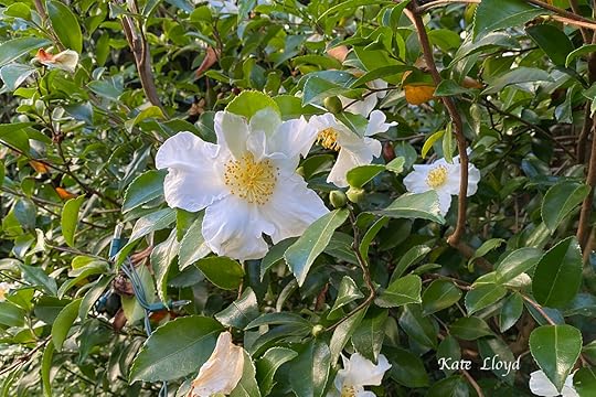 admiring the white winter blooming camellias that grow alongside our house. Plus