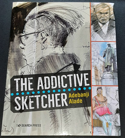 This month he’s followed up with a second book titled Addictive. This isn’t a traditional how-to book; it’s better. Addictive is 275 pages (8.5″ x 8.5″) of Adebanji’s blood, sweat, and tears. It’s the entire contents of his over-stuffed sketchbooks. What makes it so useful, at least to me, is that he works with several mediums (ballpoint, pencil, fineliners, oil pencils) and adds color and shading using a small set of Tombow markers. Studying the gazillion sketches in this book is a treat.