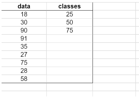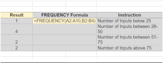 Here, data refers to the range or array with the values that are required to be counted. Classes refer to the range with a set of classes. It should be noted that the classes must be sorted to have clarity. The FREQUENCY will output in the form of a specific vertical sized range one greater than classes. An example of the use of this function is given below.