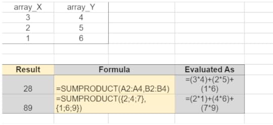 This array function multiplies 2 or more corresponding entries of equal-sized arrays or ranges and then determines their sum. This function is pivotal in situations where we need to multiply entries across arrays and determine their sum. Following is the syntax for this function.