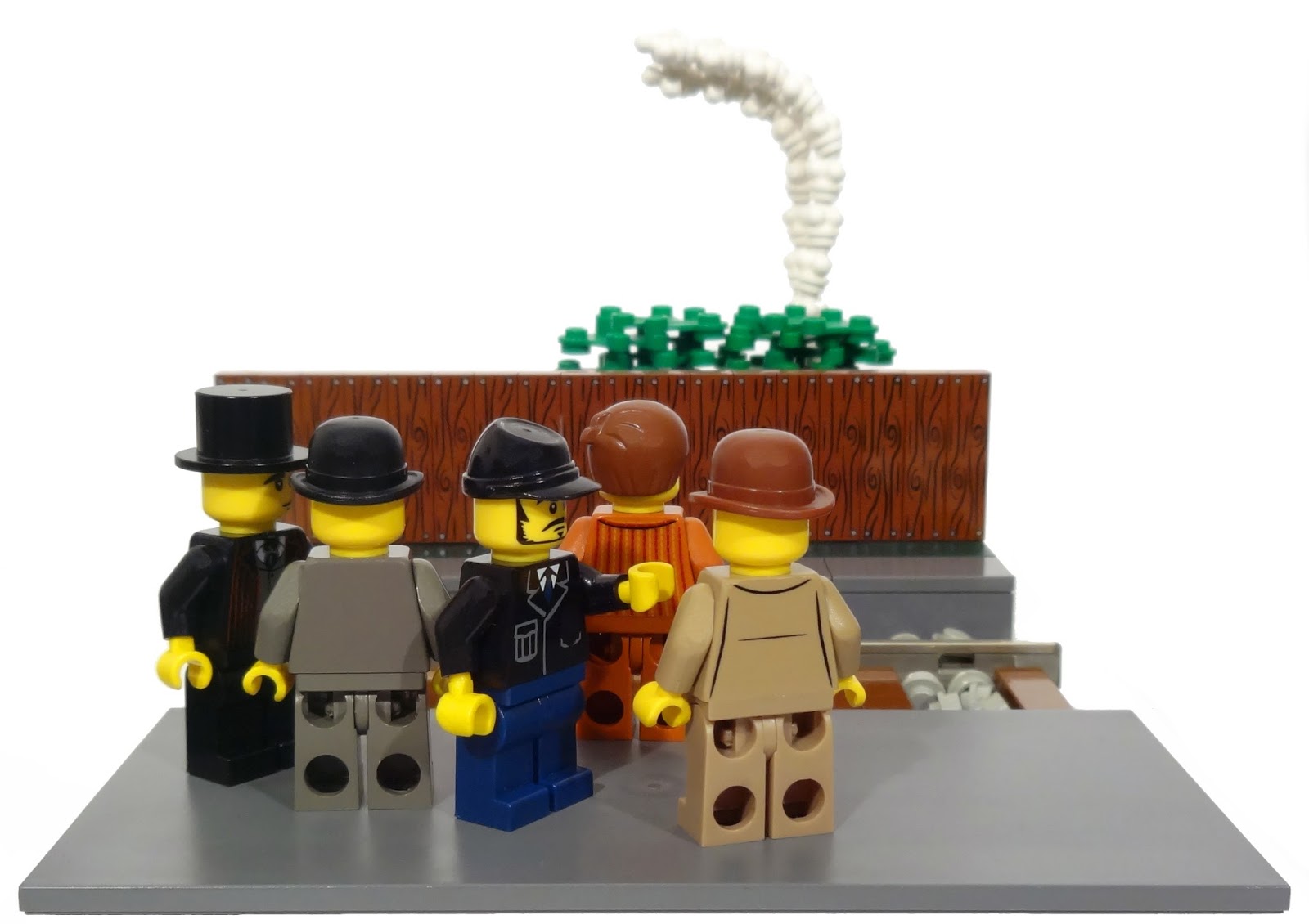 “A house on fire.”As a result of all the travelling to the countryside to investigate cases, a number of illustrations depict Holmes and Watson on board a train or at the station. This includes the iconic photo of Holmes and Watson discussing the murder of Charles McCarthy while sitting in a train carriage on their way to Herefordshire, as recounted in ‘The Boscombe Valley Mystery’ (see my post from March 22nd). A quite similar illustration of Holmes and Watson also appears in ‘The Adventure of Silver Blaze’. Other stories in which Holmes is depicted as either travelling by train or at the station upon arrival or departure include: ‘The Adventure of the Navel Treaty’, ‘The Final Problem’ and ‘The Adventure of the Dancing Men’, which I hope will be the next story published in the Sherlock Holmes Re-Imagined book series. In ‘The Adventure of the Engineer’s Thumb’, Sidney Paget also chose to illustrate Holmes, Watson, their client Victor Hatherley, as well as Inspector Bradstreet and a plain-clothes officer from Scotland Yard on the platform at Eyford Station. As far as rendering this illustration in LEGO® (see photo above), the challenge was to depict the large column of smoke rising up in the distance behind some trees. This was achieved by using a couple of stacks of white which appear in a large number of LEGO® minifigure sets.