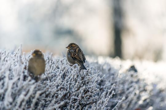 The window is cold against my shoulder as I stare out at the bleak garden. The trees are stark lines of ink. The flowers have faded, the plants resting. A robin hops up on to the bird table and pecks at the seed I put out there earlier. A second robin joins the first but the first robin chases the second one away. They zoom around the garden and over the hedge. Their flight disturbs a flock of sparrows which launches in to the air and they flap around each other, cheeping loudly. They settle back in to the hedge as a blackbird swoops down to the edge of the pond. Despite the cold, it jumps in to the shallows and washes vigorously, water droplets splashing everywhere.