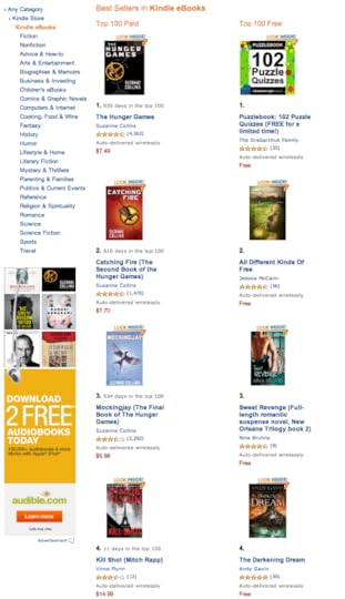 On February 7 and 8 I put The Darkening Dream on 48 hours of Kindle Select free promo. The book tore through the charts to "sell" (I mean give away) over 21,000 copies. In the first 24 hours it propelled itself to #7 free book in the entire Kindle store and for February 8 spent most of the day camped at #4.I was duking it out with that shirtless romance for two days!