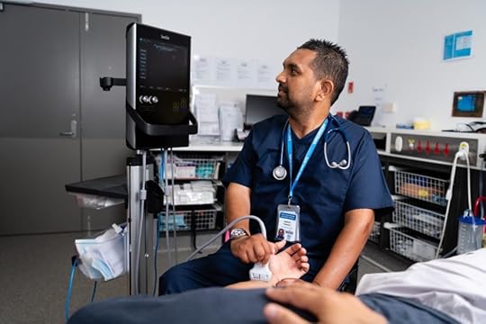Image: a doctor, in a hospital ward, monitoring a patient’s foot. The doctor is looking at a screen. .