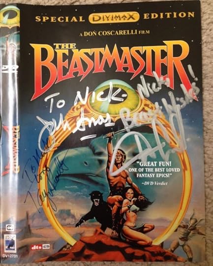 The Beastmaster DVD autographed by Tanya Roberts, John Amos, and Don Coscarelli.