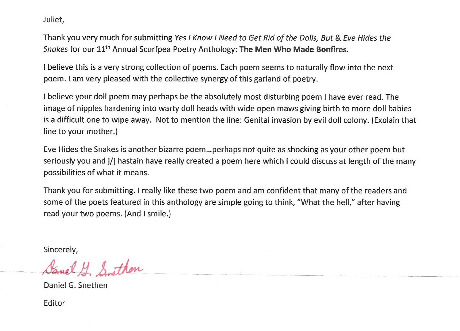 I recently received a contributor copy in the mail with a wonderful letter from Daniel G. Snethen. Some people might not like having their poem(s) described this way, but I love it. Here's a photo of the front of the anthology - a scan of the letter - and my individual poem..