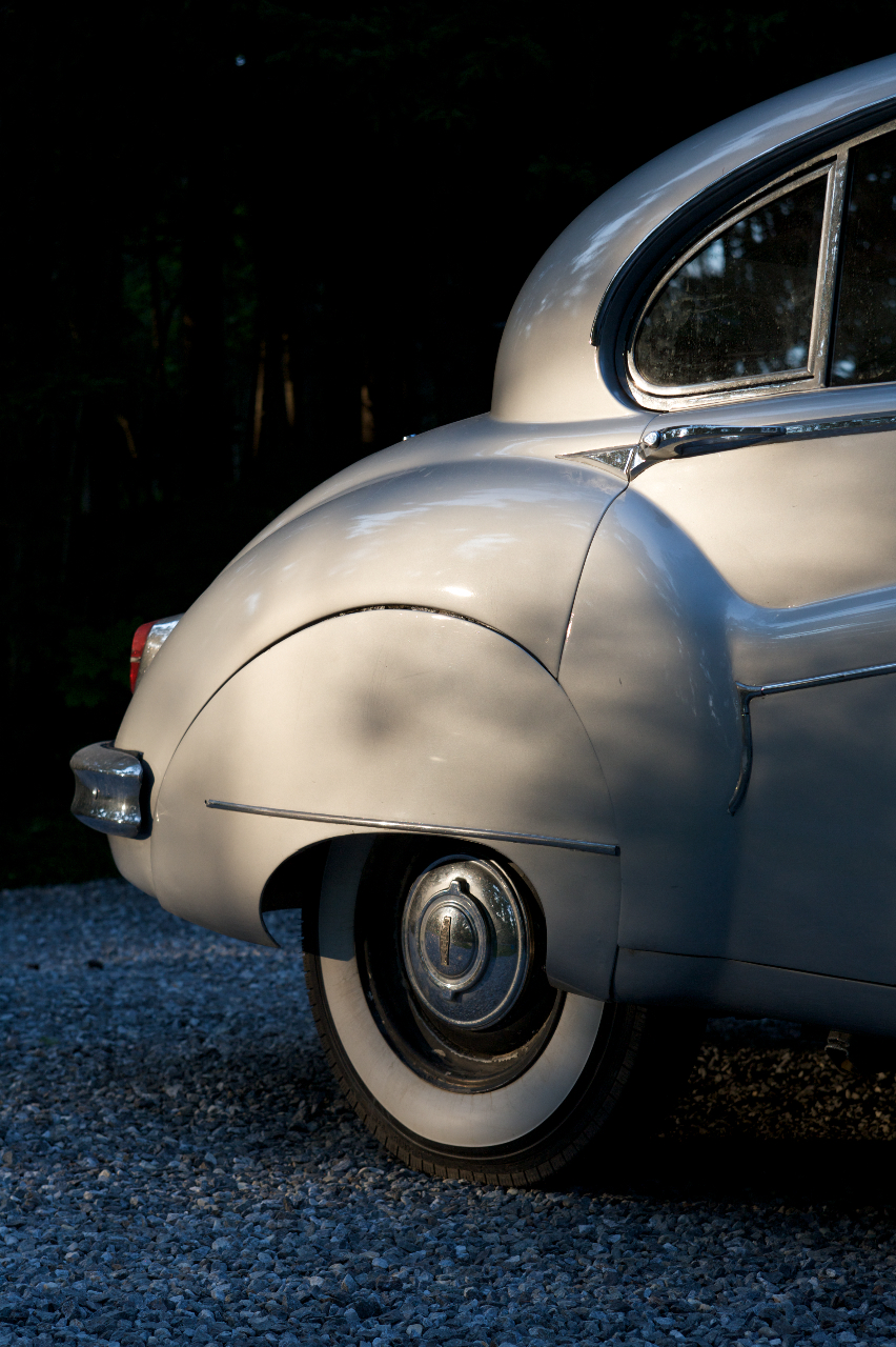 This image just in from photographer Alison Langley. My guess is: a 1956 Jaguar Mk VII. But I'm not very up on big English saloons of the 1950s. I know that a big Jag was one way to go if you wanted walnut-and-English-leather ambience without paying for Rolls or Bentley. Never could quite figure where Daimlers fit into the English car class-system. Saw the Queen riding in one, once.