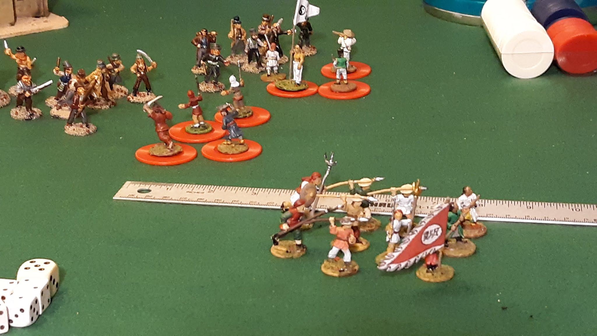 The Chinese side had five "units." These were the two heroes far to the rear and the three 10 man units of Tong fighters, two of which had taken heavy casualties already and were greatly weakened.